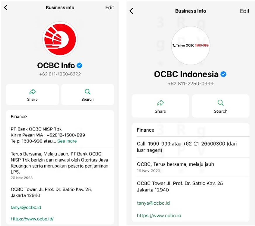 Pelaku biasanya membuat akun yang menyerupai Bank atau perusahaan ternama lainnya untuk mengirim pesan. Pastikan profil pengirim merupakan profil resmi dari instansi yang memiliki logo verified pada profil. Apabila kamu mendapatkan pesan dari OCBC, pastikan pesan tersebut berasal dari akun resmi seperti di bawah ini:
