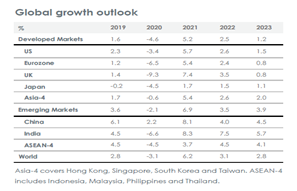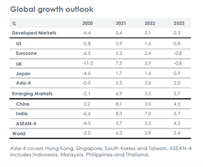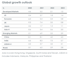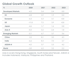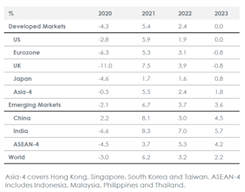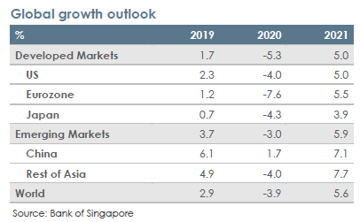 • Secara tentatif, kami telah merevisi perkiraan pertumbuhan di negara maju dari 1.6% bulan lalu menjadi -2.9%, dengan semua wilayah mengalami kontraksi tajam. Tidak dapat dihindari, mungkin ada kesalahan pada margin. Pasar negara berkembang juga akan menghadapi tantangan besar, dengan perkiraan pertumbuhan di 1.9% dibandingkan dengan 4.1% bulan lalu. Hal ini membuat tingkat pertumbuhan berada pada level nol, dibandingkan dengan 3.8% dari dekade sebelumnya.
