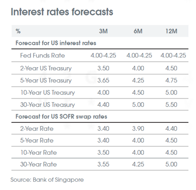 Meningkatnya ketidakpastian kebijakan dari pemerintahan Trump kemungkinan akan membuat suku bunga tetap fluktuatif. Kami memperkirakan imbal hasil UST 10 tahun akan berkisar di kisaran 4.00-4.50% dalam jangka pendek, namun tetap berhati-hati dalam jangka panjang mengingat masih adanya kekhawatiran terhadap defisit fiskal.
