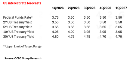 OCBC Group Research mempertahankan skenario dasarnya (base case) untuk satu kali pemangkasan suku bunga dana federal sebesar 25bp pada kuartal pertama 2026. Pemangkasan selanjutnya akan bergantung pada pergerakan inflasi, jika mendekati target Fed sebesar 2%.