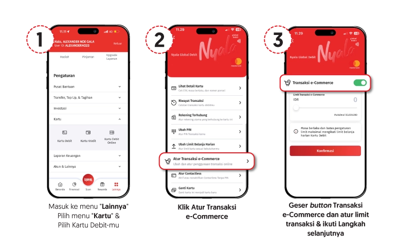 - Reward berupa cashback didapatkan dengan menjaga rata-rata saldo tabungan sampai dengan akhir bulan sesuai skema dan melakukan transaksi minimum Rp100.000,- di aplikasi AYO Indonesia selama periode program berlangsung menggunakan Kartu Debit/ QRIS OCBC. Untuk transaksi menggunakan Kartu Debit pada aplikasi AYO Indonesia, pastikan Nasabah sudah mengaktifkan fitur transaksi e-Commerce pada menu Lainnya dam pilih Kartu Debit lalu pilih atur limit e-Commerce di OCBC mobile.