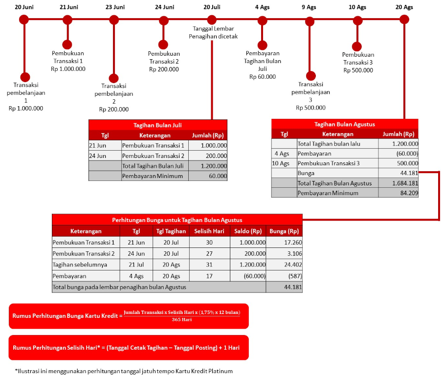 Bunga akan dikenakan jika Pemegang Kartu membayar kurang dari total tagihan baru. atau membayar setelah Tanggal Jatuh Tempo. Bunga untuk Transaksi Pembelanjaan dihitung berdasarkan Tanggal Pembukuan (Posting Date) dari transaksi yang dilakukan. Suku bunga yang berlaku untuk transaksi pembelanjaan tercantum pada Lembar Penagihan. Biaya. denda. ataupun bunga yang belum dibayarkan tidak termasuk dalam komponen perhitungan bunga. Bunga akan ditagihkan pada lembar penagihan berikutnya. Untuk perhitungan bunga secara lengkap dapat dilihat pada ilustrasi perhitungan bunga kartu kredit.