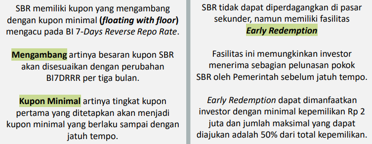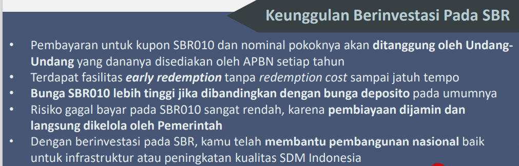 Parents, ada loh alternatif investasi selain deposito, pemerintah Indonesia sedang mengeluarkan produk Saving Bond Retail, SBR010, tentunya dengan imbal hasil 5.1% per tahun. Lebih tinggi dari bunga deposito yang hanya dikisaran 3% saja, namun tetap aman dan dijamin oleh pemerintah. Ada baiknya, dana pendidikan anak disisihkan terlebih dahulu, lalu kupon dari SBR bisa dibelanjakan. Jadi, biaya pendidikan aman terkendali, tapi bisa tetap beli baju bayi.