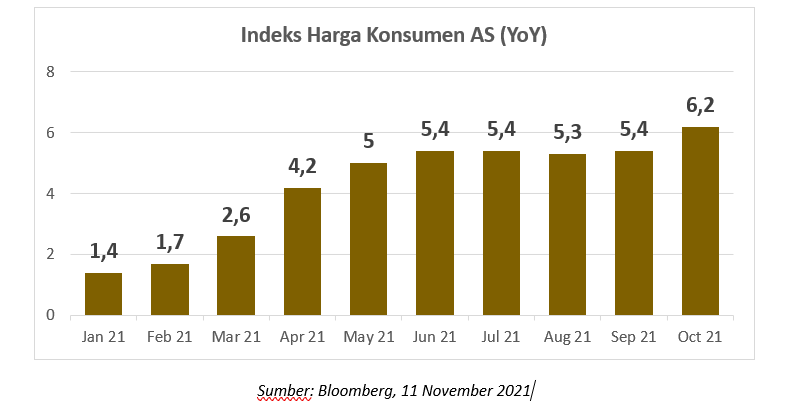 Inflasi atau Indeks Harga Konsumen (IHK) di AS periode Oktober 2021 mencapai level tertinggi dalam 30 tahun terakhir, sejak Desember 1990. Departemen Tenaga Kerja AS melaporkan bahwa IHK naik 6.2% secara tahunan (YoY), di atas estimasi sebesar 5.9% YoY, dan naik 0.9% secara bulanan (MoM), diatas estimasi sebesar 0.6% MoM.