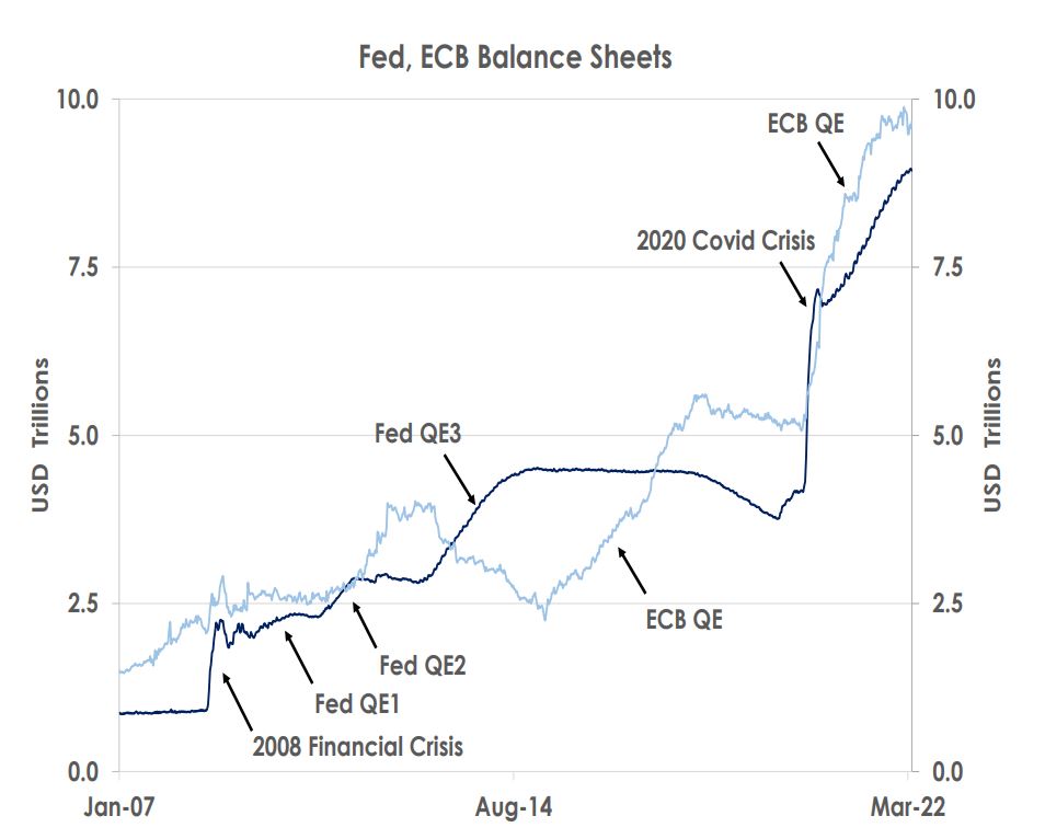 The chart shows the Fed’s and the European Central Bank’s balance sheets soared during the pandemic through quantitative easing (QE) bond purchases. The Fed’s rose from USD4 trillion to USD9 trillion. But now with US inflation near 8%, March’s meeting minutes signalled the Fed, from as early as May, will start rapidly cutting its balance sheet. By capping the reinvestment of its maturing bond holdings over an initial three- month period, the Fed intends to cut its balance sheet consistently by USD95 billion a month. Thus, its quantitative tightening (QT) will result in its bond holdings falling by over USD1 trillion a year.