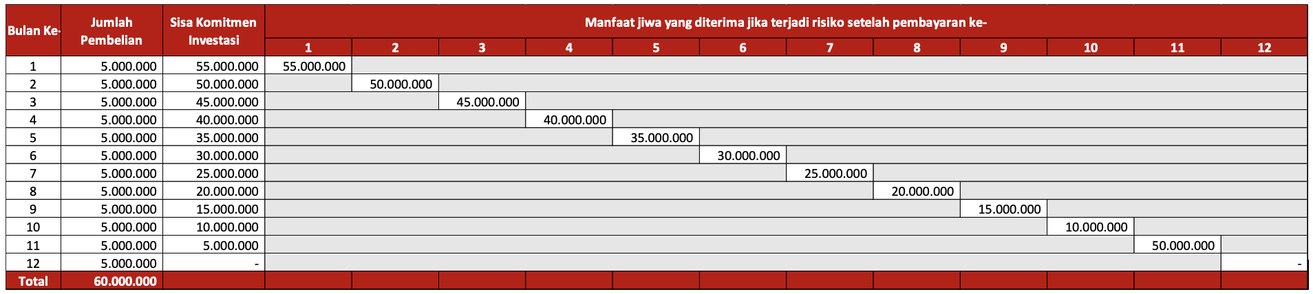 Sebagai contoh, Bapak A mengikuti RDB OCBC NISP pada reksa dana XYZ dengan tenor satu tahun, dengan nominal investasi Rp 5.000.000 per bulan. Apabila terjadi risiko jiwa pada Bapak A, maka akan diberikan manfaat jiwa sejumlah sisa total investasi yang masih harus dibayar.