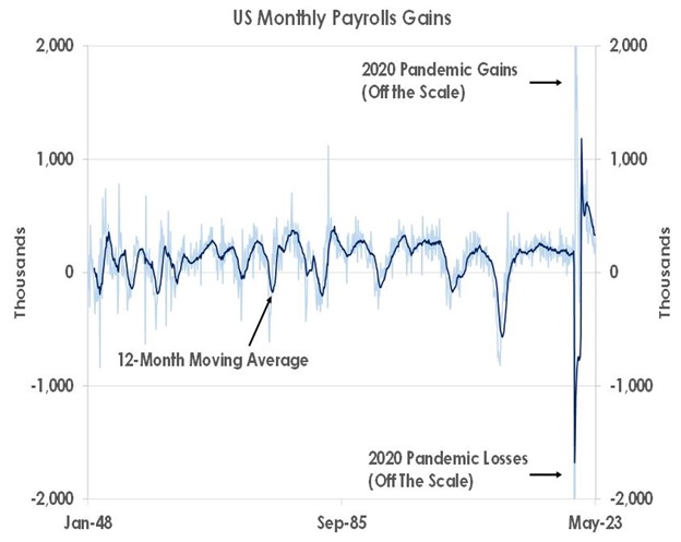 The overall trend of payrolls gains is slowing as the first chart shows. But wages are still increasing by 4.4% compared to a year ago given the large rise in average hourly earnings last month.