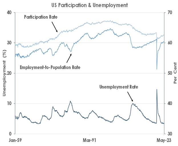 The rest of April’s jobs data was firm too. The unemployment rate fell back to 53-year lows of 3.4% as the second chart shows. Average hourly earnings rose 0.5%, the fastest pace in a year for wage growth, while the average workweek remained unchanged at 34.4 hours.