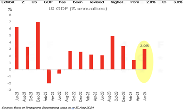 PDB riil AS 2Q24 direvisi naik 0.2 ppt menjadi +3.0% (tahunan), klaim pengangguran awal turun 2,000 menjadi 231,000 untuk periode 24 Agustus. US Conference Board (Indeks Kepercayaan Konsumen) juga naik melampaui ekspektasi menjadi 103.3 pada bulan Agustus.