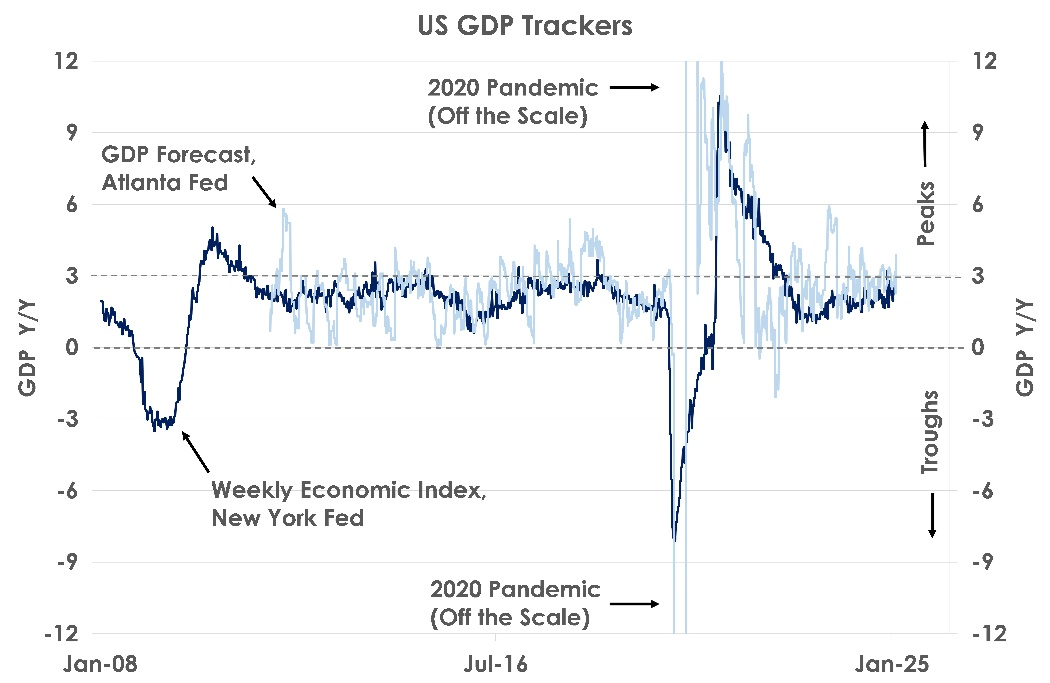 Thirdly, high-frequency trackers of US GDP from Fed institutions estimate growth currently may be as high as 3-4% - after GDP already expanded by a strong 2.8% in 2024.
