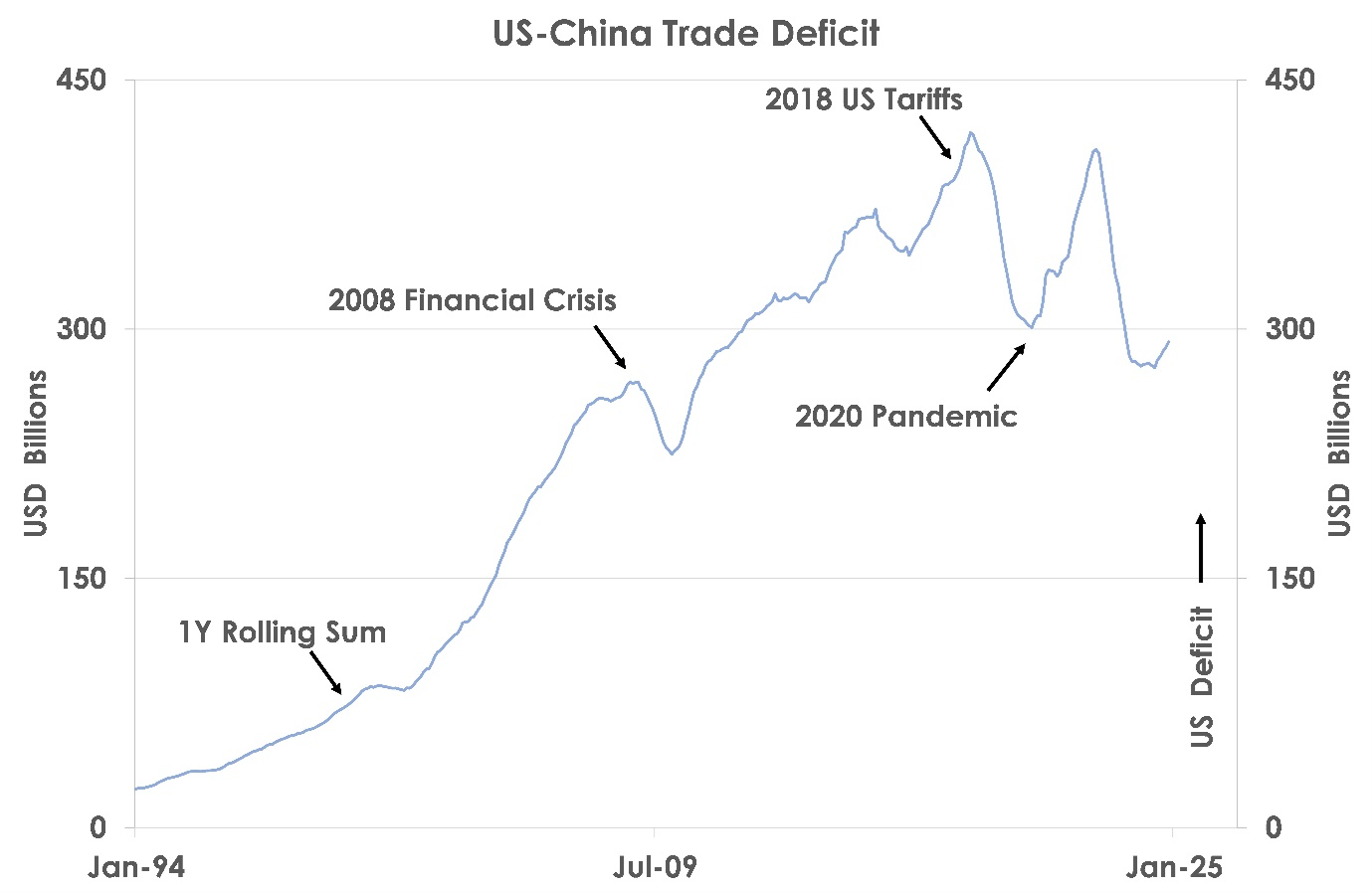 The second chart shows when the first Trump administration set 10-25% tariffs on USD200 billion of Chinese exports in 2018, China’s trade surplus with the US fell from over USD400 billion to USD300 billion though Beijing also agreed to buy more US goods.