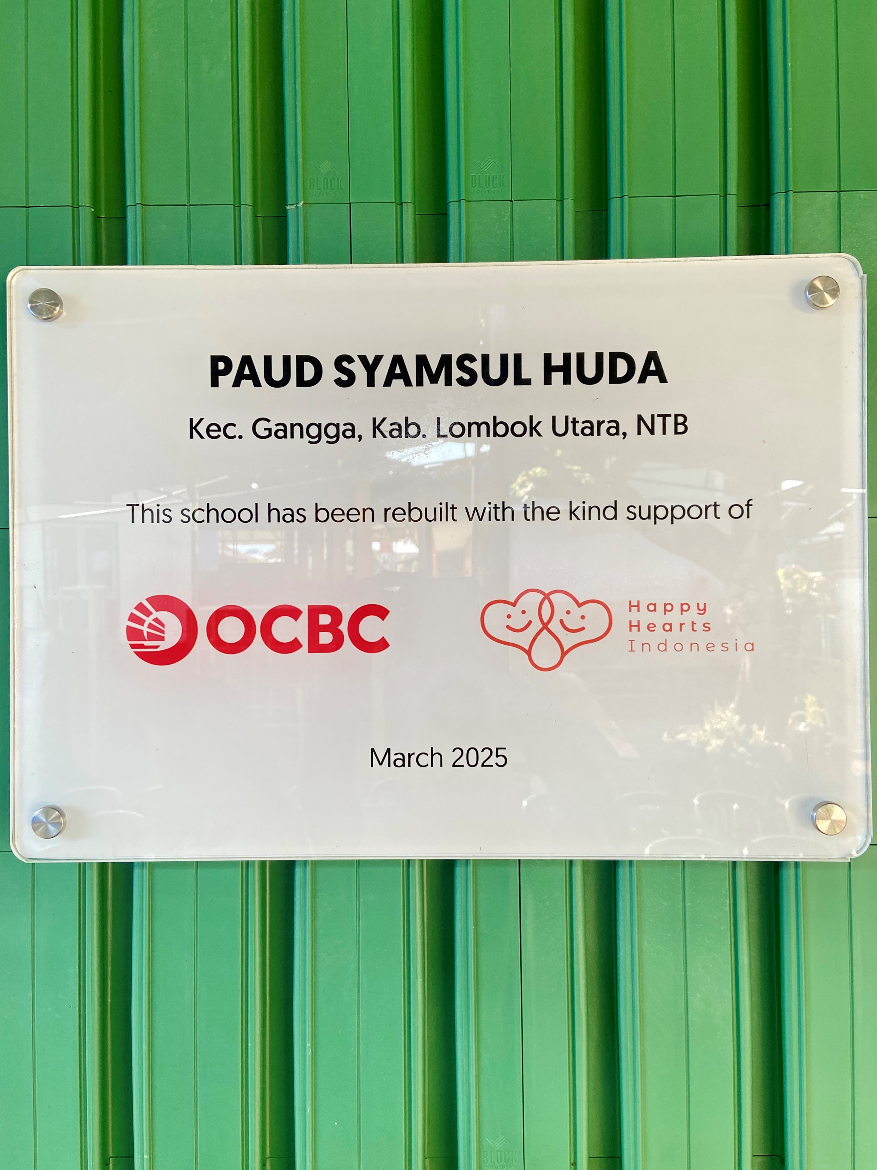Pada bulan Februari 2025, proses pembangunan kembali dimulai, termasuk pembangunan dua ruang kelas, satu toilet, furnitur, serta area bermain untuk anak-anak. Di pertengahan bulan Februari lalu, tim OCBC Indonesia juga mengunjungi Sekolah PAUD Syamsul Haud dan mengadakan acara peresmian. Acara ini turut dihadiri oleh Head of Human Resources, National Network Head, dan Brand Communication Division Head.