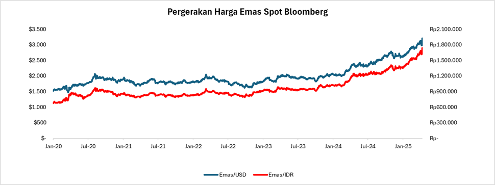 Dari perkembangan tarif terbaru, Indonesia termasuk dalam 185 negara mitra dagang AS yang menjadi sasaran tarif dagang resiprokal. Meskipun penerapan tarif masih ditunda hingga Juni-2025 mendatang, namun ketidakpastian tarif turut mempengaruhi fluktuasi nilai tukar dalam negeri dan pergerakan harga emas terhadap Rupiah.