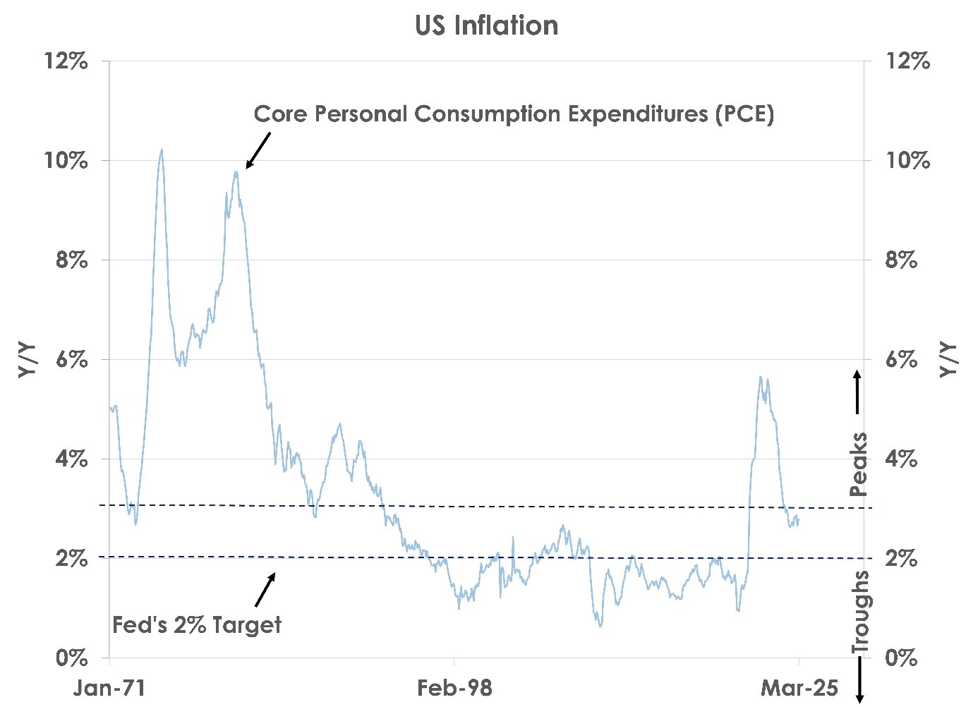 Financial markets fear Trump may try to fire Powell, compromising the Fed’s independence, stopping officials from setting interest rates freely and thus letting inflation soar as a weak Fed allowed in the 1970s as the chart shows.