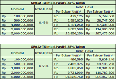 Ini merupakan seri ketiga dari Surat Berharga Negara (SBN) Ritel yang diterbitkan di tahun ini. SR022 merupakan produk investasi syariah dimana nilai pokok*) dan kupon dijamin 100% oleh negara dan menjadi salah satu alternatif investasi yang bisa dipilih oleh investor untuk mendapatkan passive income. *)nilai pokok di jamin jika dicairkan saat jatuh tempo
